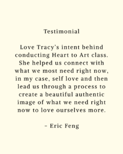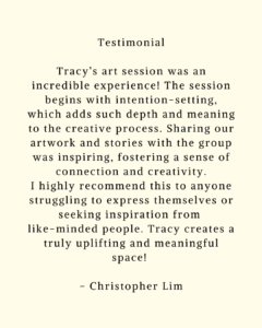 Chris didn’t feel comfortable being filmed while sharing and I 100% respect that. Heart to Art will always be a safe space whether you want to share, not share, be filmed or not, it’s all about what makes you feel comfortable. What matters most is showing up, creating, and being present with your heart. I’m also really glad Chris still shared his art story with us in class, it meant a lot!